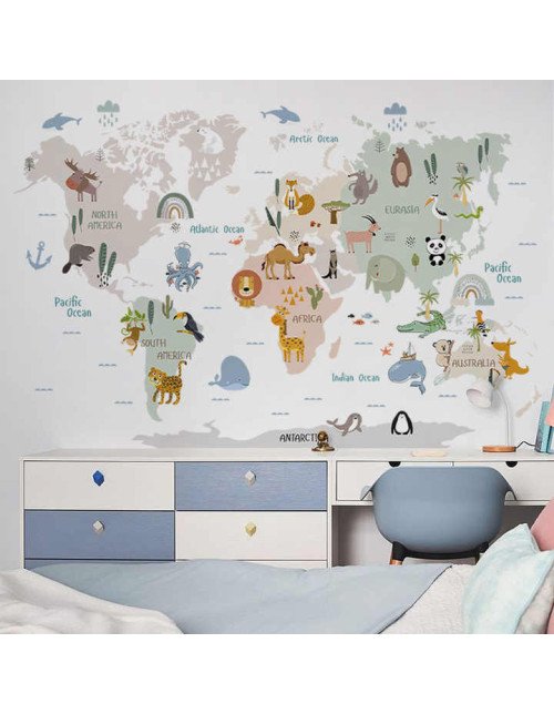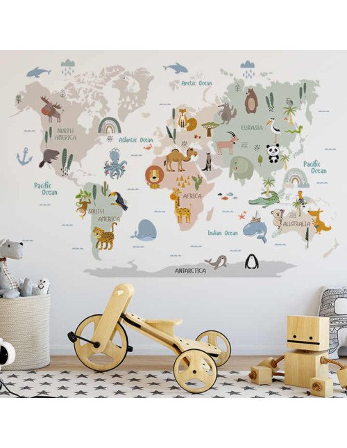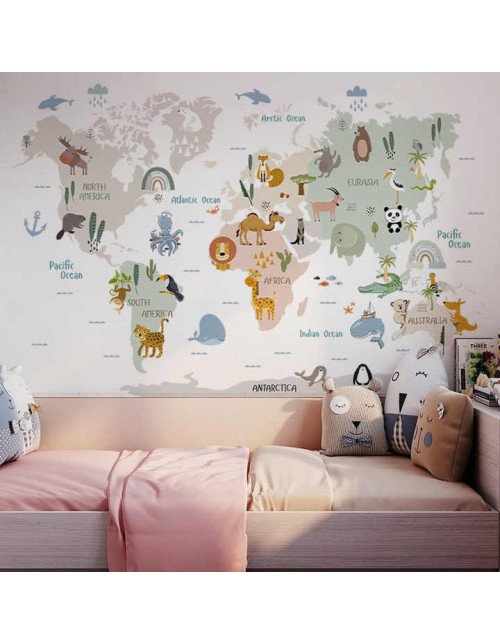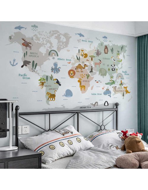 Kids Room Decoration Self-adhesive Cartoon Animal 3d World Map Wall Stickers